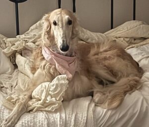 In the spring of 2025 we added to this pack with a beautiful fawn Borzoi named Bunny! The greyhounds couldn’t care less but Nicky had lost his status as top dog. He had to concede the couch and our bed to this big, beautiful girl.