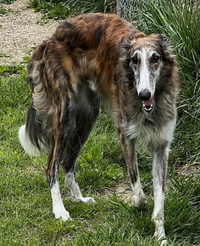 Nicky is a beautiful male brindle Borzoi(FKA Russian Wolfhound). He had a long journey to us through the National Borzoi Rescue Foundation from Ukraine. He was a refugee from the war there.